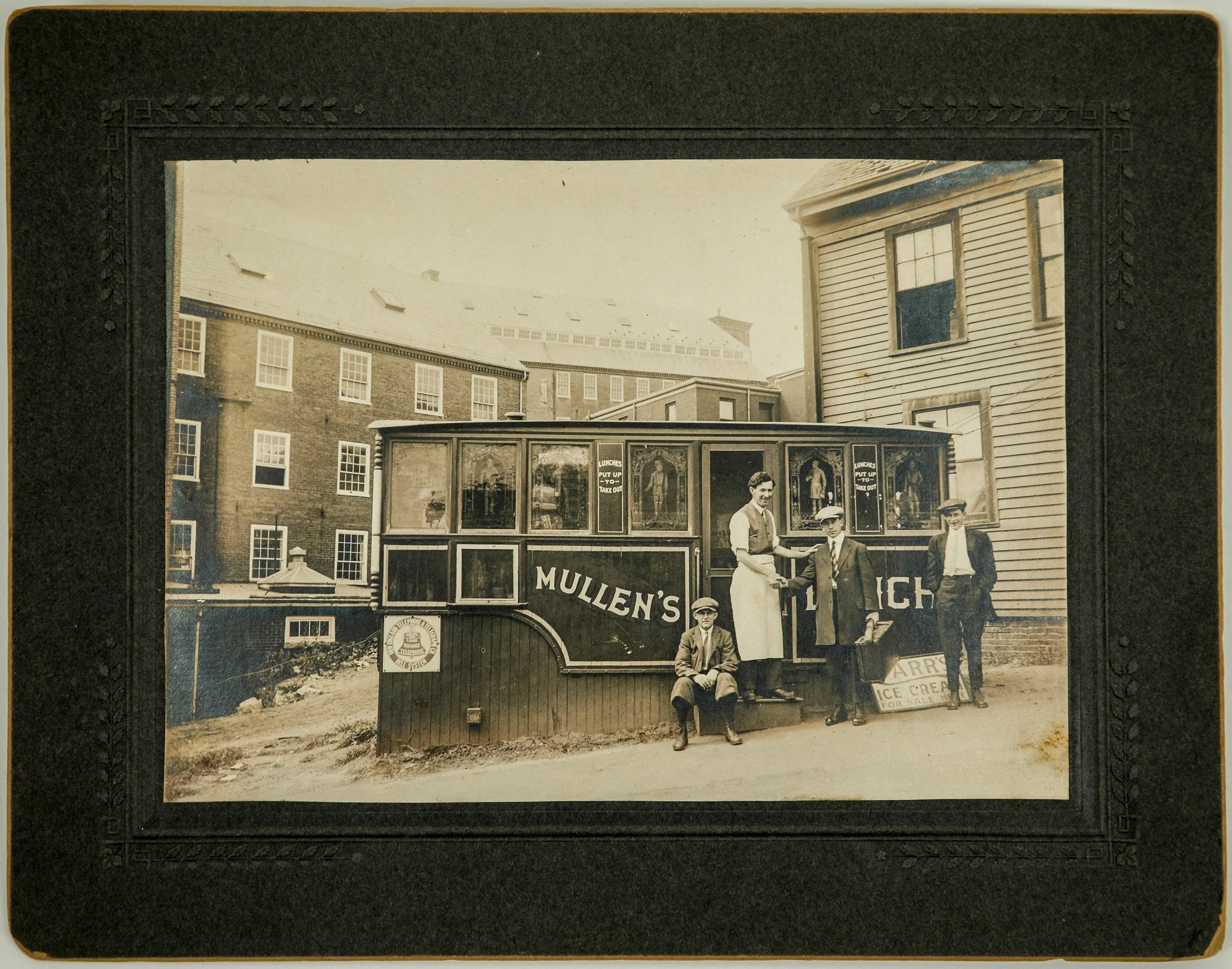Now a mostly wood-sided building, a brick facade hints at the past of this former mill building pictured behind Mullen’s lunch car. Explore the history of the structure and its changing uses through maps and photographs.